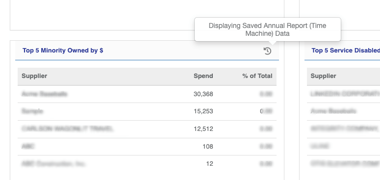 Imagine that ABC Corp was sold to a large publicly traded company on April 1, 2021 and is now no longer woman owned or a Certified WBE. When you are in Time Machine mode, the $100 in spend for ABC Corp on March 24, 2021 will still show as WBE and Certified because you spent $100 with ABC Corp when they were WBE and Certified.